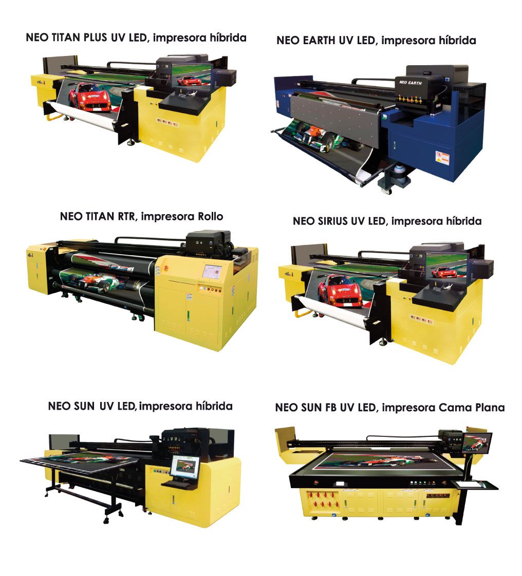 NEO TITAN PLUS HIBRIDA (Impresora de curado UV led híbrida 720x1440 dpi) Sistema de impresión de cama plana / hibrido, que permite la impresión tanto en sustratos rígidos como en rollo a rollo, con 4 cabezales independientes de color más blanco y barniz, bajo curado de lámparas led UV de bajo consumo. |